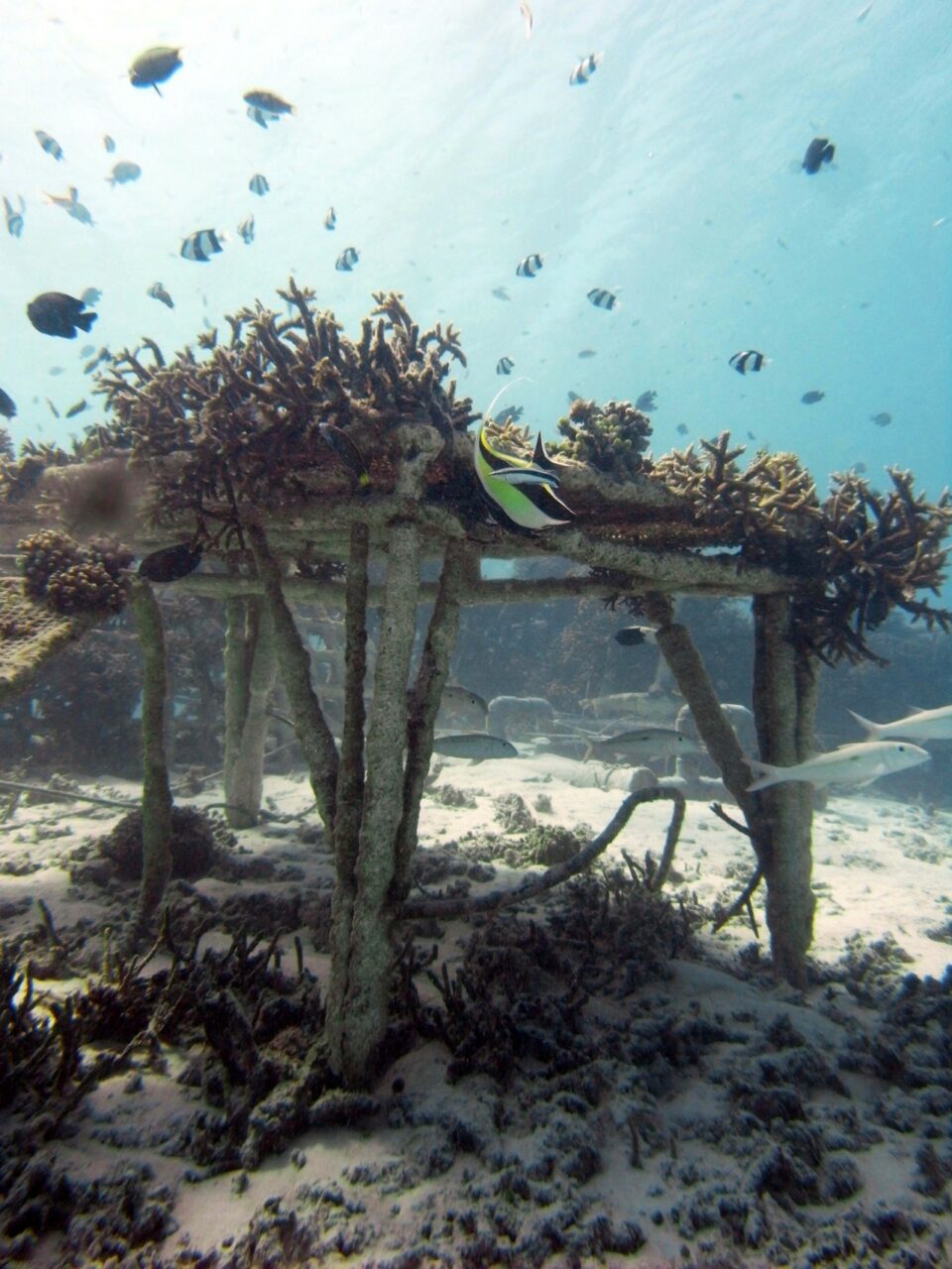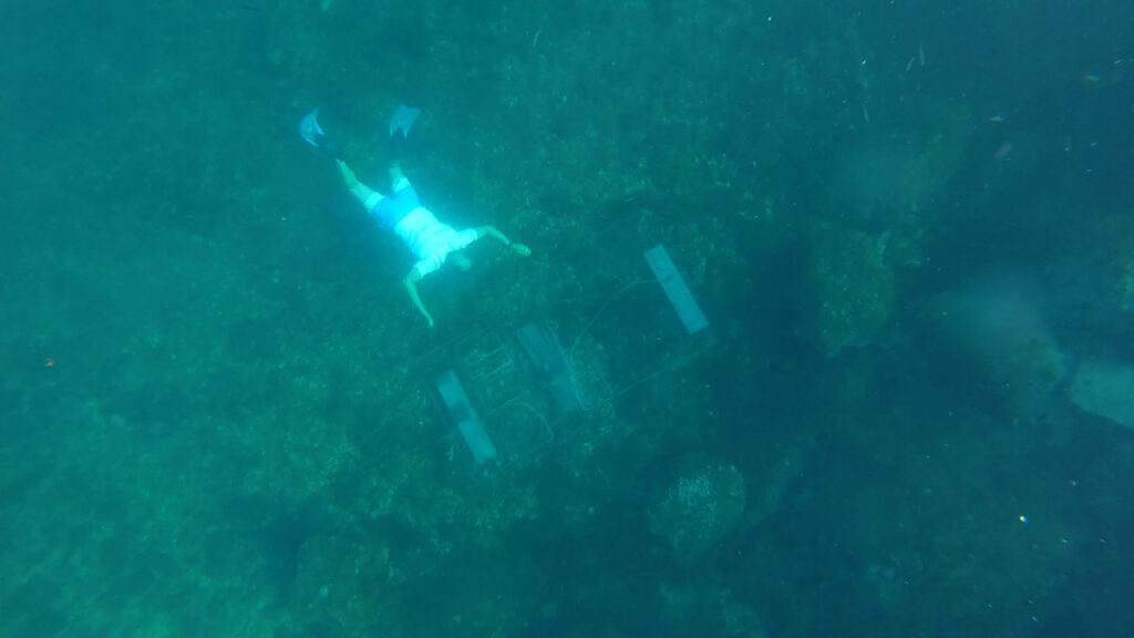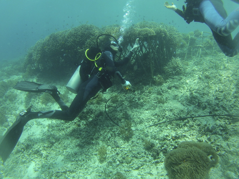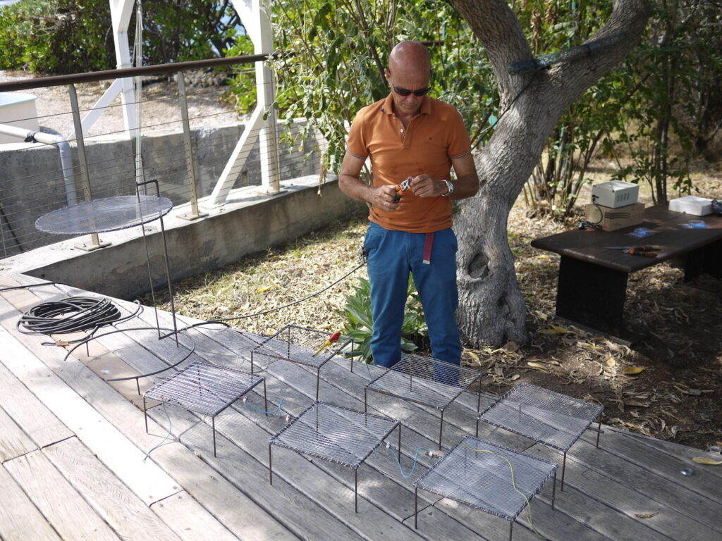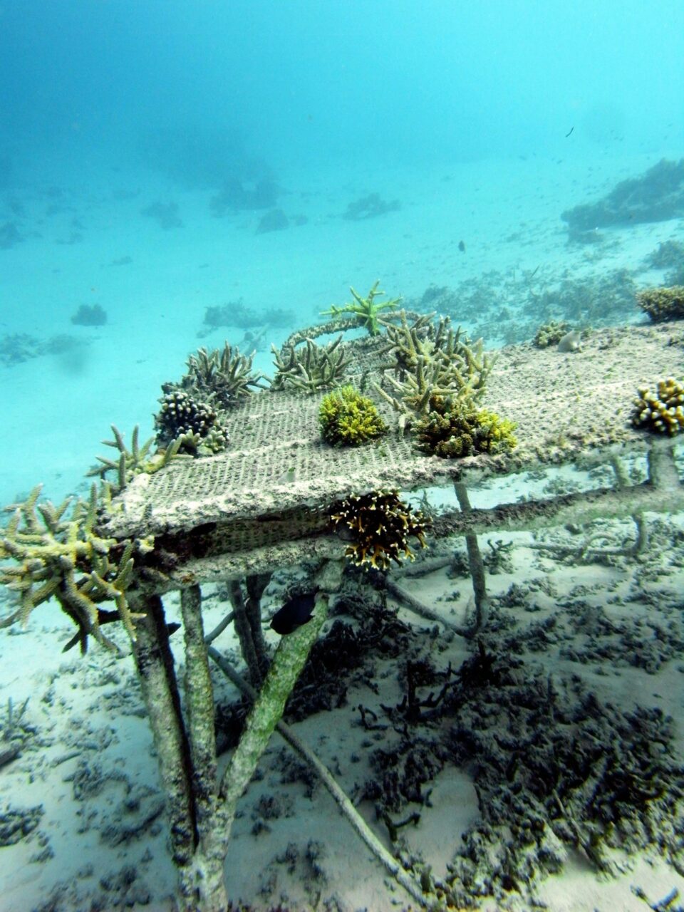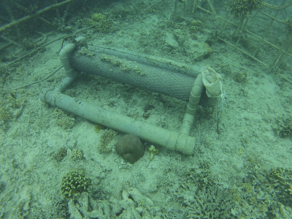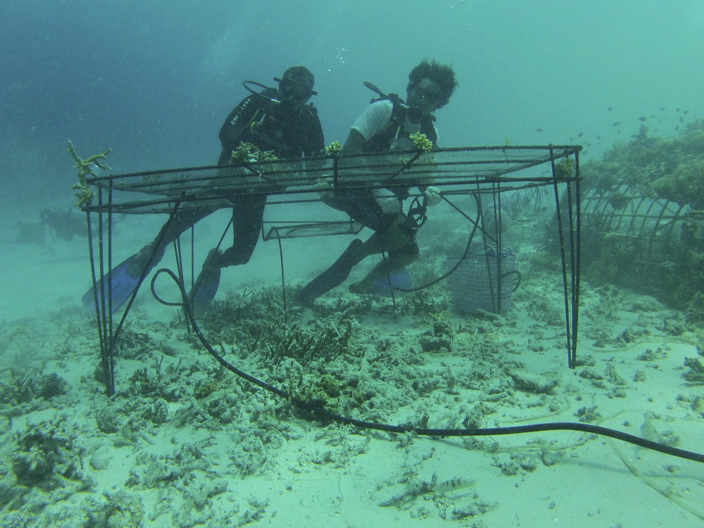Pick up the table and the chair on the beach, bring them by boat, immerse, find the good place, connect, attach corals on it, having fun with Komang and Paulus… under the eyes of Thomas J. Goreau.