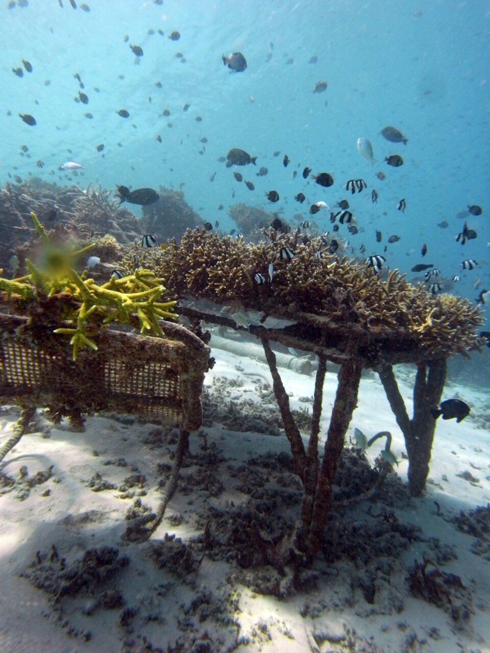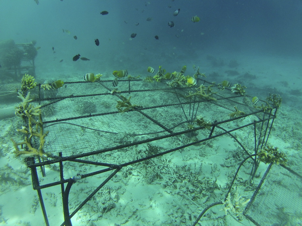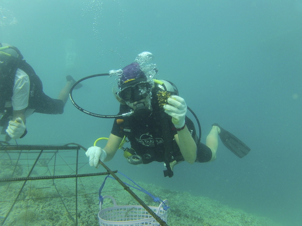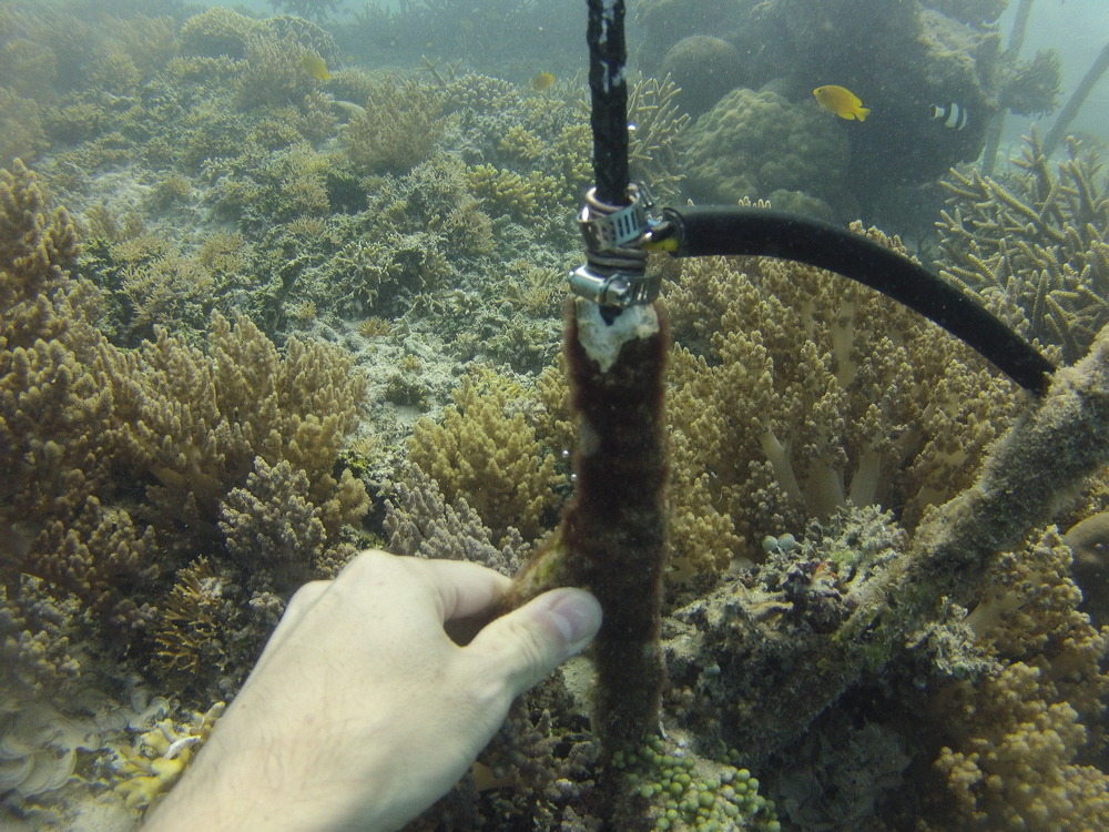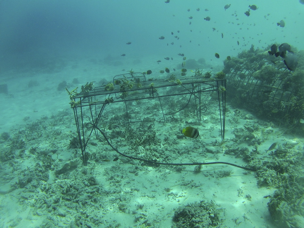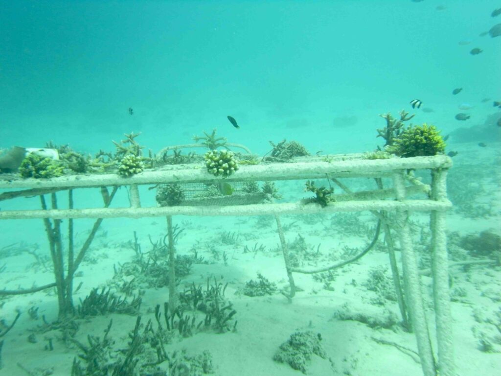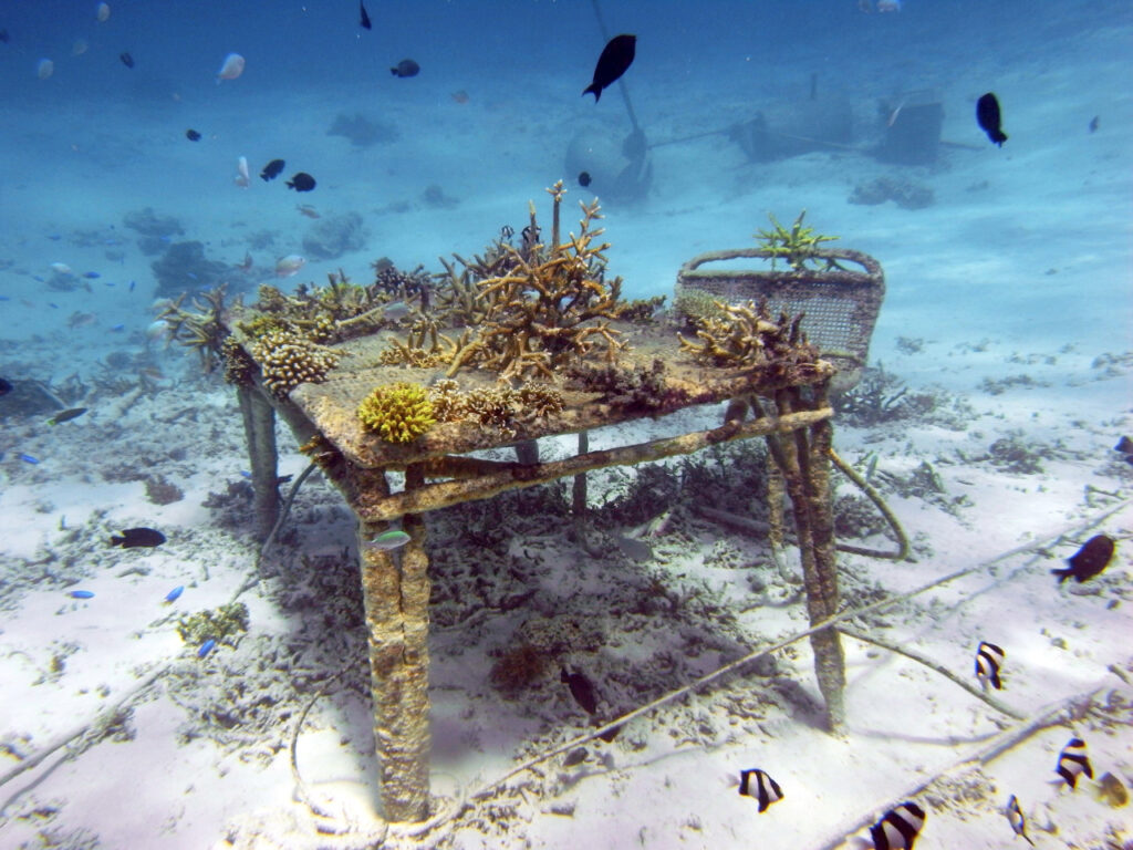 Pick up the table and the chair on the beach, bring them by boat, immerse, find the good place, connect, attach corals on it, having fun with Komang and Paulus… under the eyes of Thomas J. Goreau.