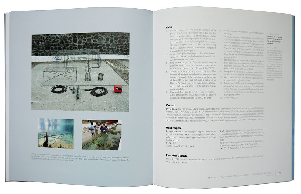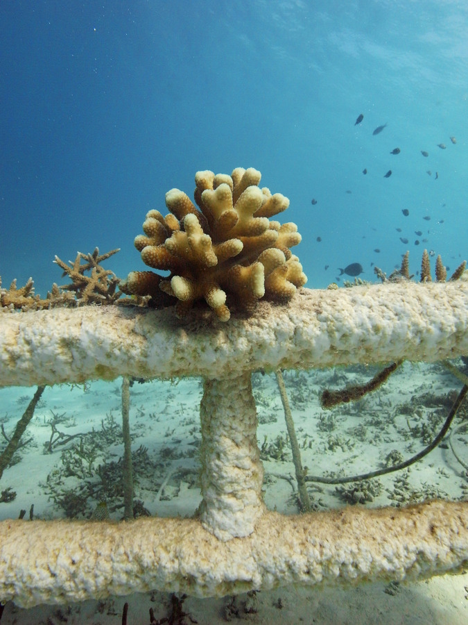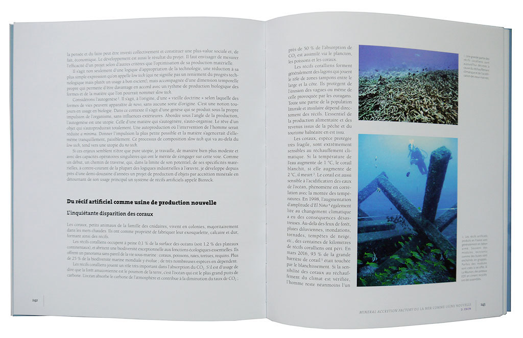 Ce mode de production d’éléments de notre environnement matériel dialogue avec l’histoire de l’exploitation du corail. Aujourd’hui préservés pour nous préserver, les récifs ont longtemps été décimés pour produire la chaux nécessaire à la construction locale de biens matériels, une ressource insulaire. > Yves-Michel Bernard. Le corail, désormais « protégé », marqueur écologique du réchauffement climatique et abri de la biodiversité sous-marine reste cependant en péril. La production d’éléments artificiels peut-elle participer à la réparation des dommages engagés ? L’ingénierie écologique est-elle une solution et / ou une simple mesure compensatoire pour se donner bonne conscience ? > Serges Planes