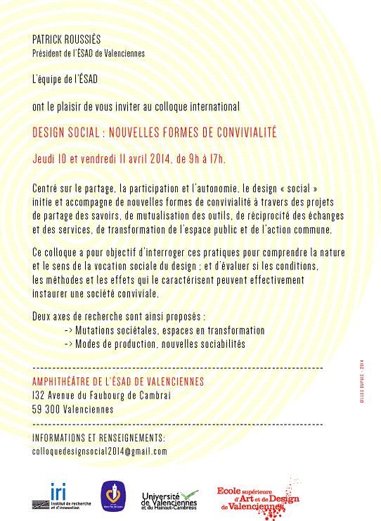 “Alterproduction (un projet) ou comment faire du mobilier en récif artificiel ?”, ma participation au colloque international “Design social, les nouvelles formes de convivialité”, tenu à l’ESAD de Valenciennes les 10 et 11 Avril 2014. Transcription au format PDF téléchargeable ici http://esadval.wix.com/recherche#!textes/chf6