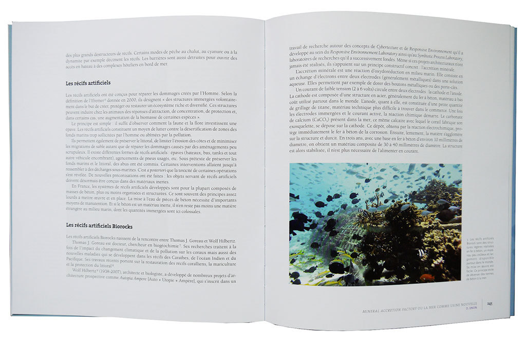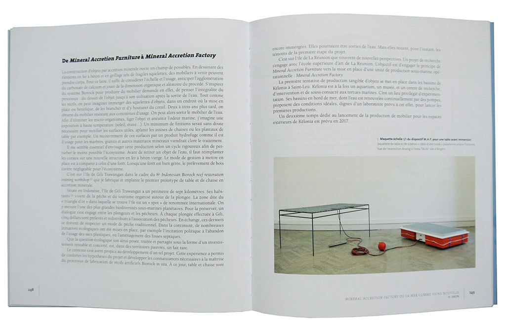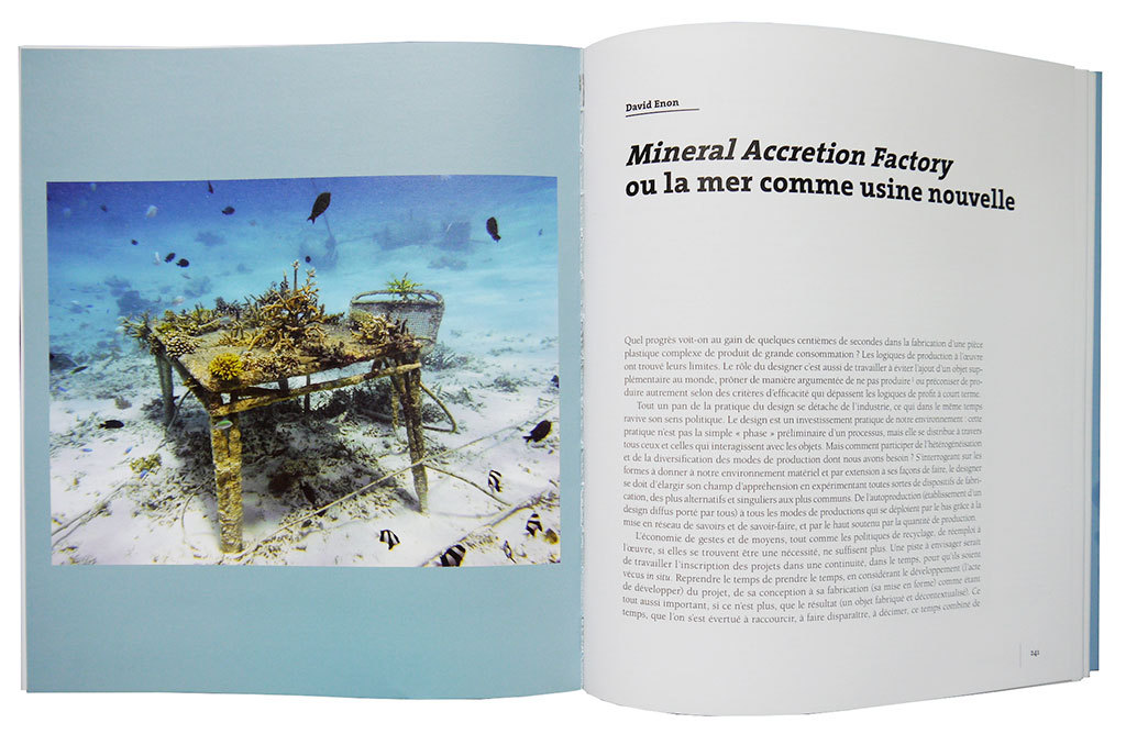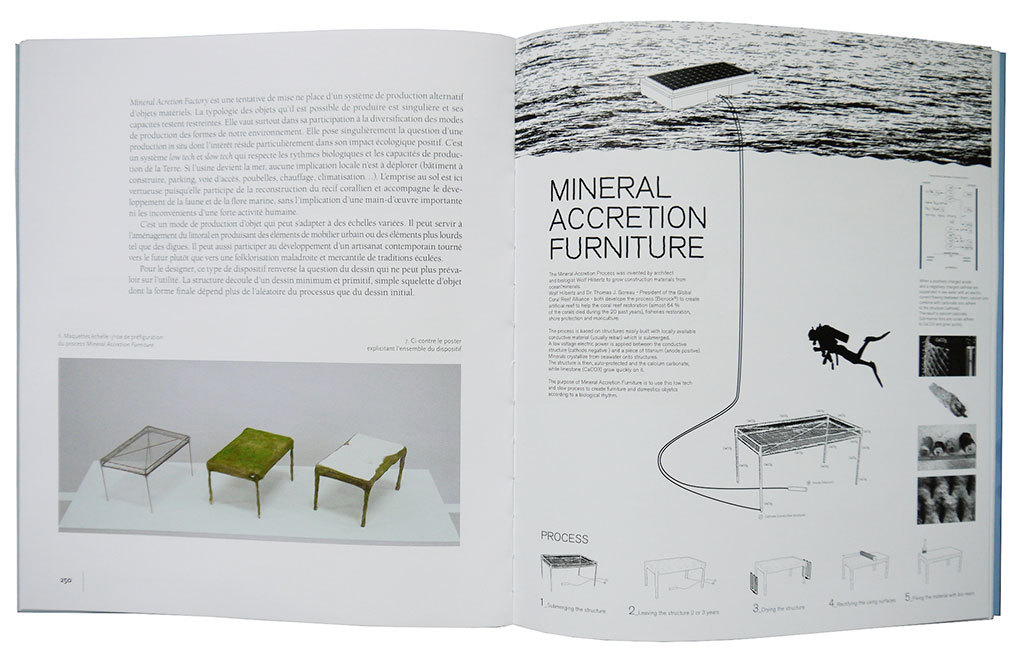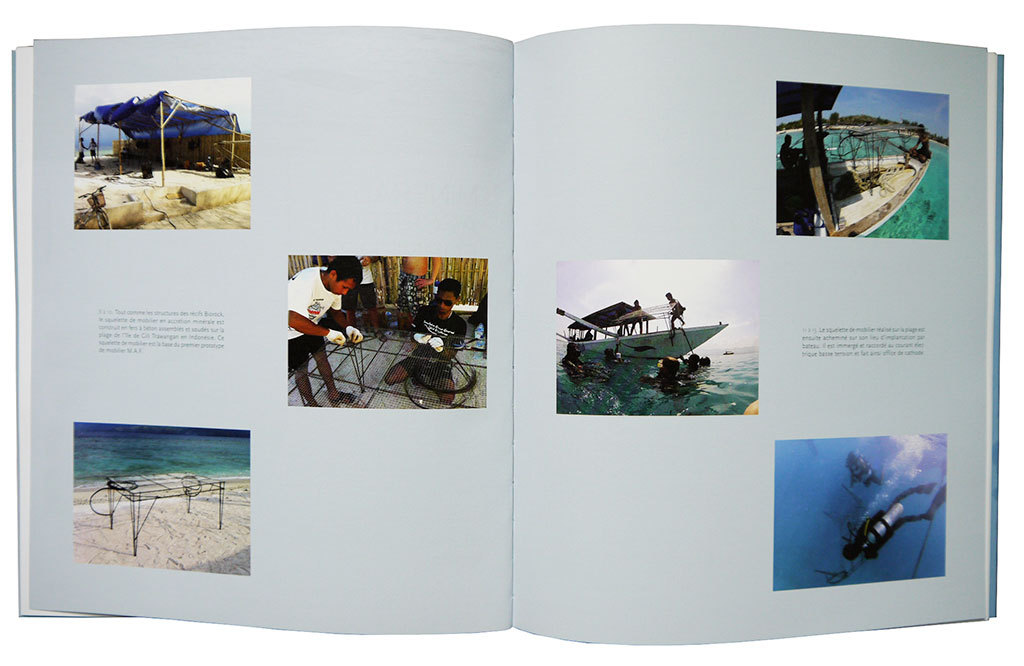 * Mineral Accretion Factory est un système alternatif de production de mobilier et d’objets qui utilise le mode de construction des récifs artificiels “Biorock” développé par l’architecte/biologiste Pr. Wolf Hilbertz (Symbiotic Process Laboratory) et le Biologiste Pr. Thomas J. Goreau (Global Coral Reef Alliance) pour la restauration des récifs coralliens et des fonds marins en général (faune, flore).