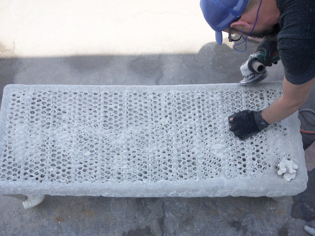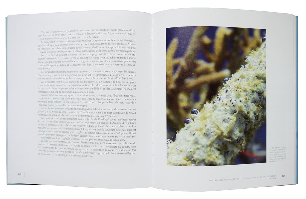 L’immersion dans la mer d’une structure en acier (squelette d’objet) reliée à une source électrique basse tension (bouée munie de panneaux solaires ou d’éolienne) enclenche une réaction électrochimique : l’objet s’auto-génère dans un matériau issu des minéraux de l’océan. Au bout de deux à trois ans le résultat obtenu est plus résistant que le béton armé.