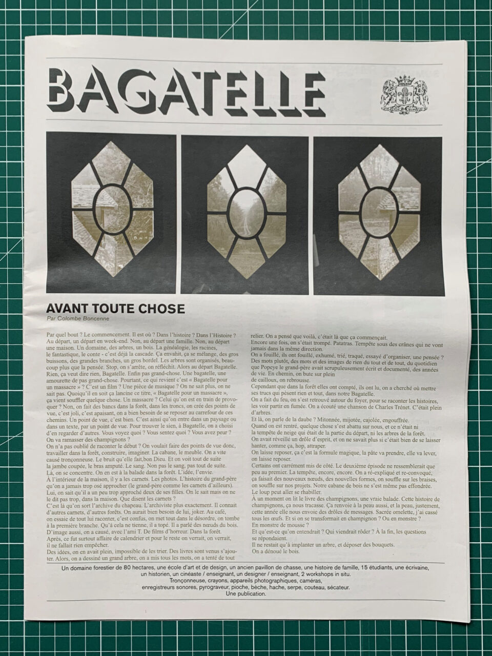 Bagatelle est un ancien pavillon de chasse, situé au milieu d’un domaine forestier de 80 hectares en Normandie. Nous y avons mené un atelier sur un an (deux sessions) avec une quinzaine d’étudiants et deux intervenants : l’historien Philippe Artières et la romancière Colombe Boncenne.