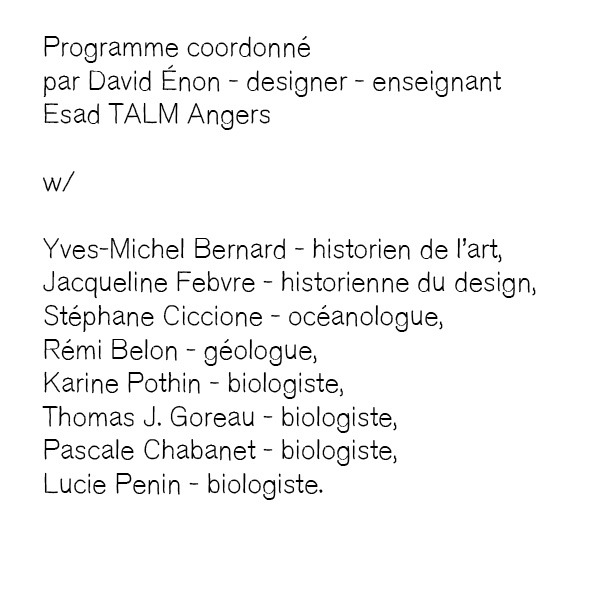 Yves-Michel Bernard (ESAR – ESAM), Historien de l’art Elise RIgot (LAAS – CNRS), Doctorante en design Serge Planes (CRIOBE – TARA pacific), Biologiste Catherine Geel (ENS Saclay – ENSA Nancy), Historienne du design Ernesto Oroza (ESAD Saint-Etienne),Designer Yann-Philippe Tastevin (CNRS), Anthropologue des techniques Emile de Vischeer (Berlin), Designer Thomas Thwaites (Londres), Designer Emanuele Coccia (HESS), Philosophe