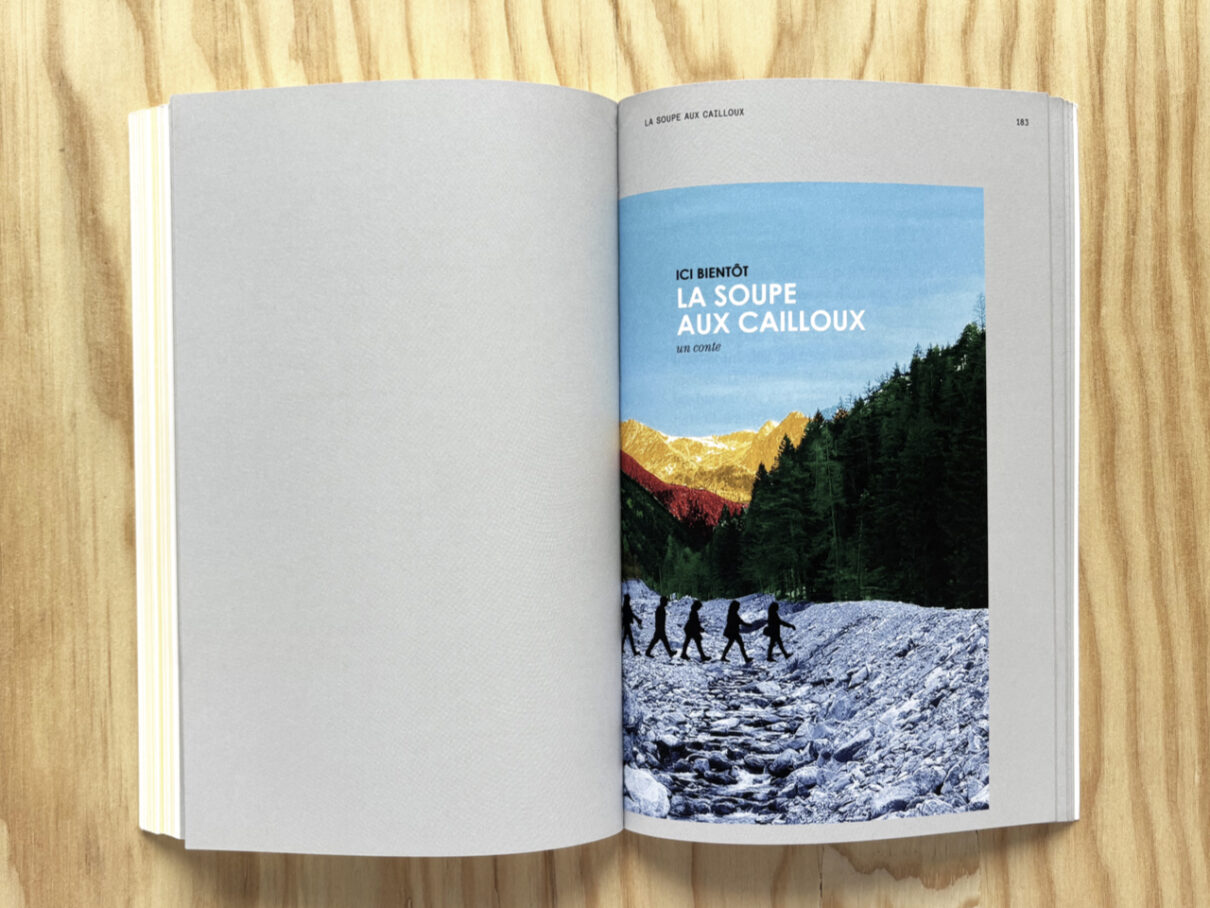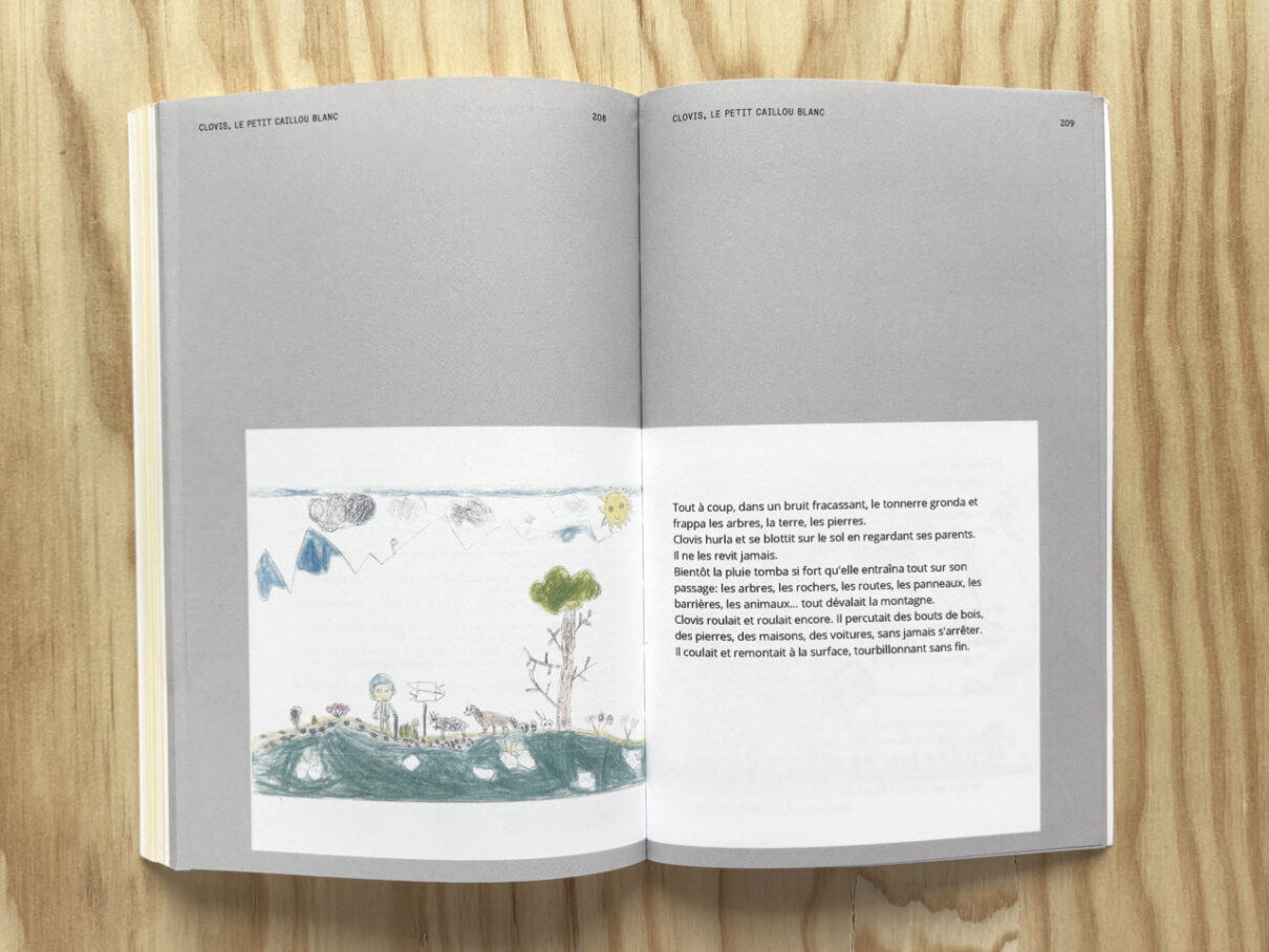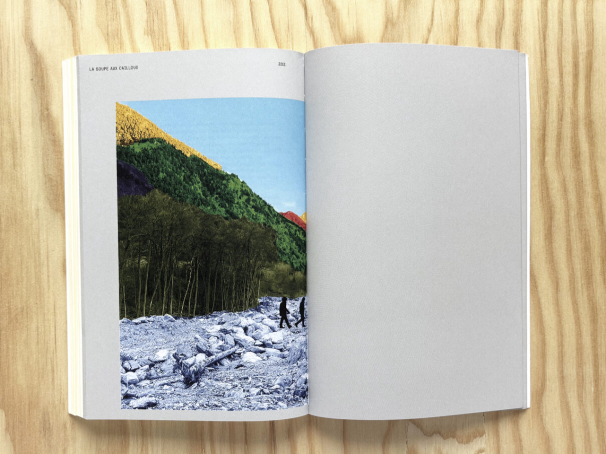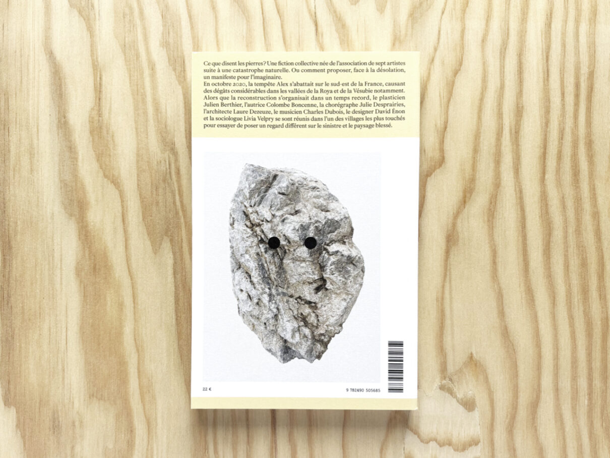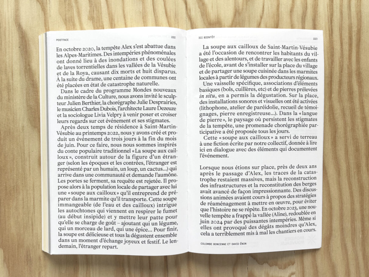 In October 2020, Storm Alex struck the Alpes-Maritimes region. Extreme weather conditions led to flooding and torrential mudslides in the Vésubie and Roya valleys. As part of the Ministry of Culture’s “Mondes nouveaux” program, novelist Colombe Boncenne, in collaboration with designer David Énon and five other artist-authors— sculptor Julien Berthier, choreographer Julie Desprairies, musician Charles Dubois, architect Laure Dezeuze, and sociologist Livia Velpry, came to observe and share their perspectives on this event and its aftermath. After two residencies in Saint-Martin-Vésubie, they created and produced a three-day event together, drawing inspiration from the traditional folk tale “La soupe aux cailloux,” which served as the foundation for a collectively written fiction. The main plot unfolds in Saint-Martin-Vésubie and serves to describe the disaster, the landscape that followed, its impermanence, its perpetual motion, and its transient reality. Yet this reality includes—without directly naming them—the artistic works created during the event, presenting them as phenomena that the local population cannot explain. Evidence, or pieces of evidence—texts, drawings, photographs—are interspersed throughout the text.
