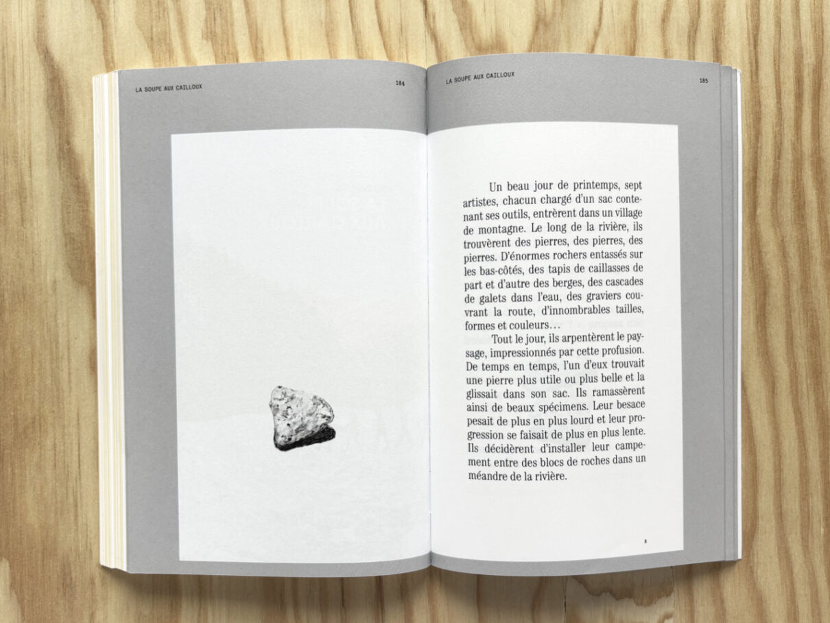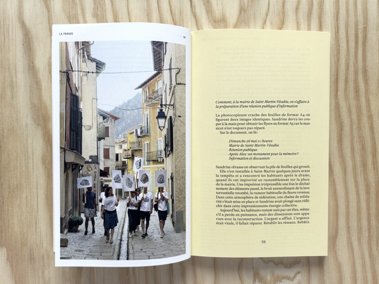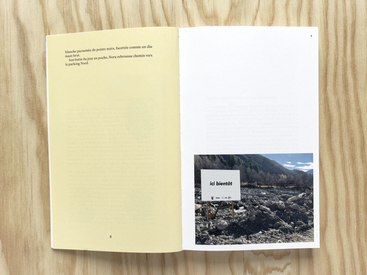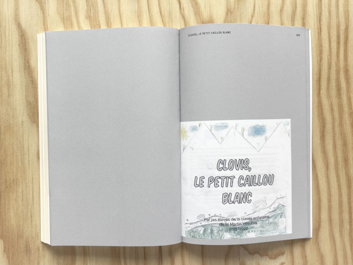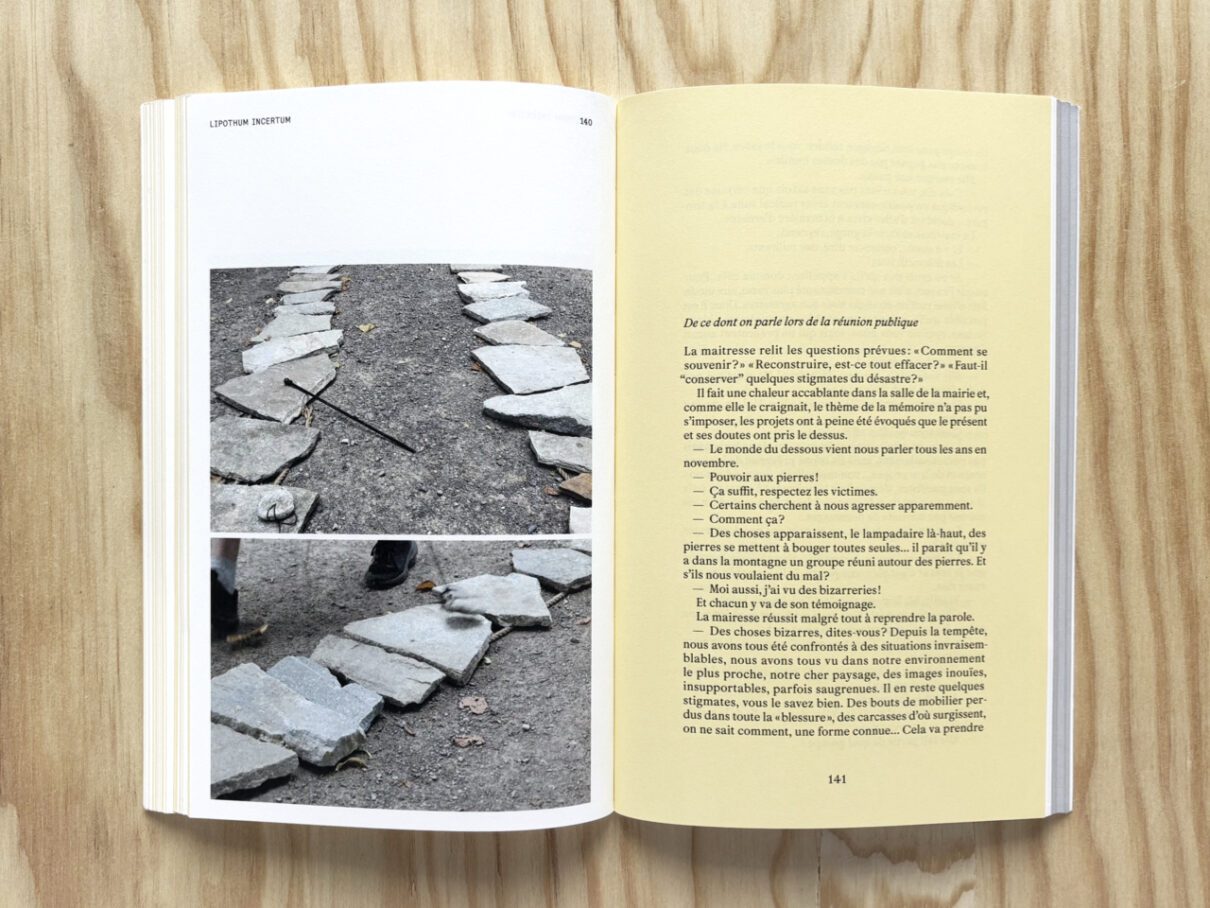 In October 2020, Storm Alex struck the Alpes-Maritimes region. Extreme weather conditions led to flooding and torrential mudslides in the Vésubie and Roya valleys. As part of the Ministry of Culture’s “Mondes nouveaux” program, novelist Colombe Boncenne, in collaboration with designer David Énon and five other artist-authors— sculptor Julien Berthier, choreographer Julie Desprairies, musician Charles Dubois, architect Laure Dezeuze, and sociologist Livia Velpry, came to observe and share their perspectives on this event and its aftermath. After two residencies in Saint-Martin-Vésubie, they created and produced a three-day event together, drawing inspiration from the traditional folk tale “La soupe aux cailloux,” which served as the foundation for a collectively written fiction. The main plot unfolds in Saint-Martin-Vésubie and serves to describe the disaster, the landscape that followed, its impermanence, its perpetual motion, and its transient reality. Yet this reality includes—without directly naming them—the artistic works created during the event, presenting them as phenomena that the local population cannot explain. Evidence, or pieces of evidence—texts, drawings, photographs—are interspersed throughout the text.