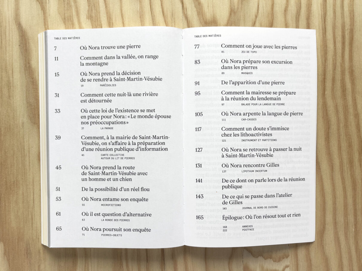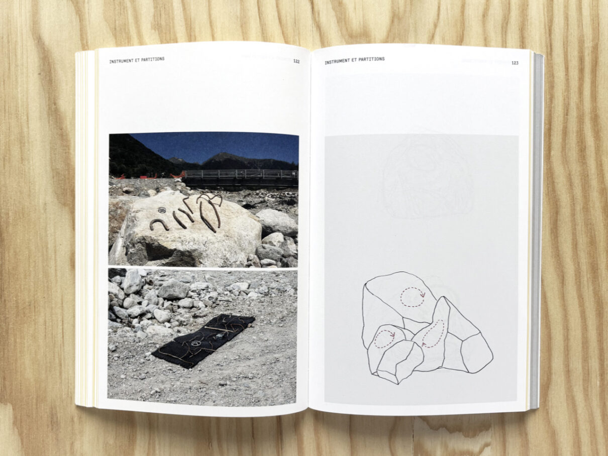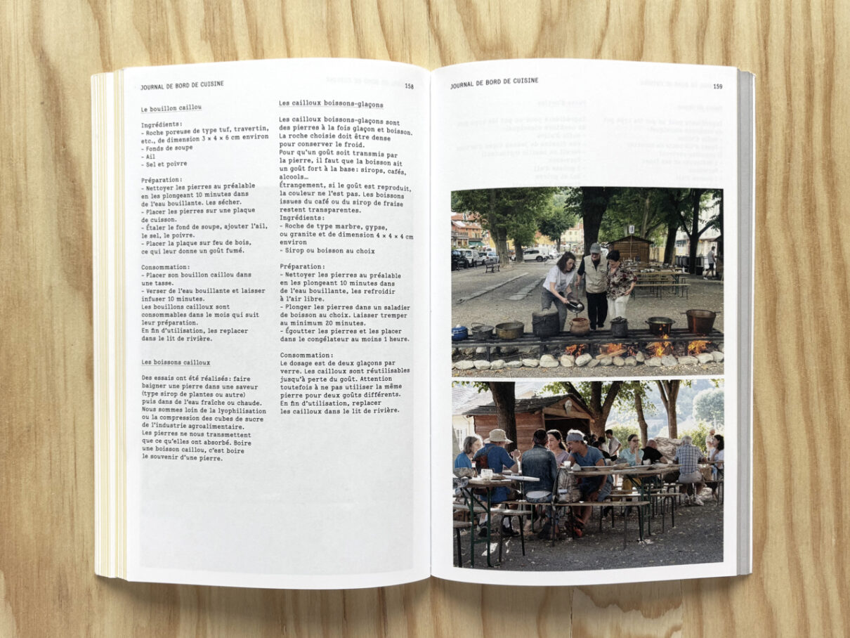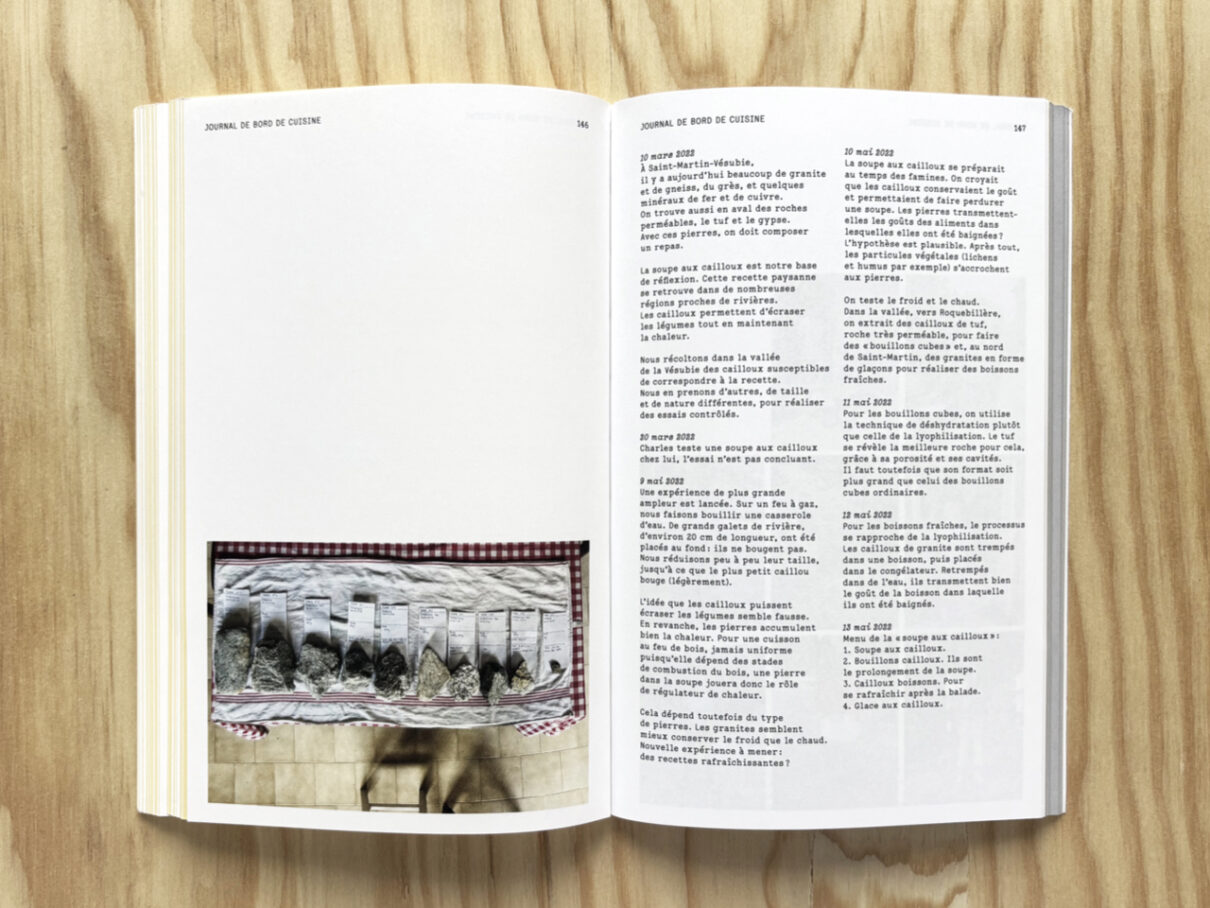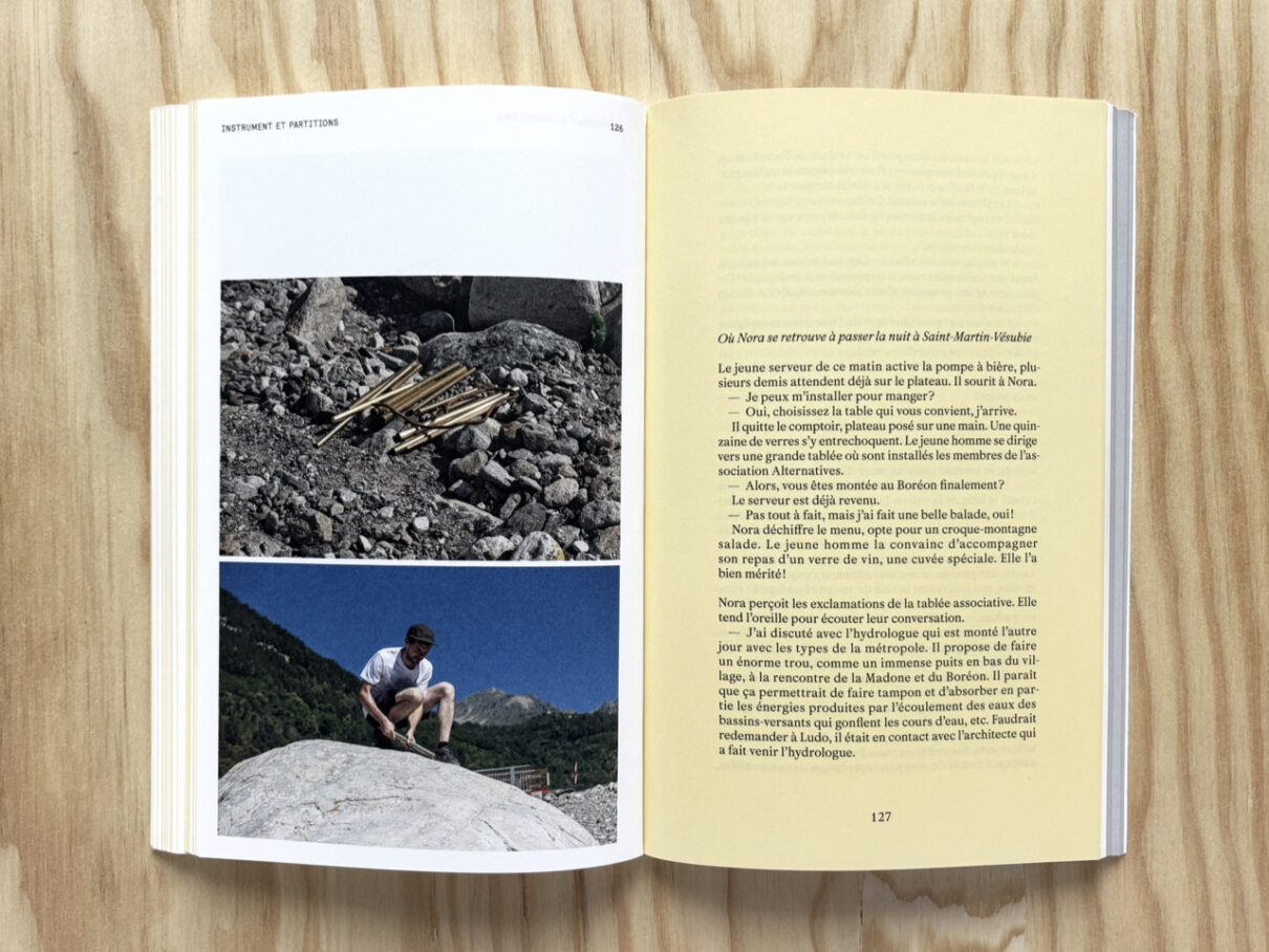 In October 2020, Storm Alex struck the Alpes-Maritimes region. Extreme weather conditions led to flooding and torrential mudslides in the Vésubie and Roya valleys. As part of the Ministry of Culture’s “Mondes nouveaux” program, novelist Colombe Boncenne, in collaboration with designer David Énon and five other artist-authors— sculptor Julien Berthier, choreographer Julie Desprairies, musician Charles Dubois, architect Laure Dezeuze, and sociologist Livia Velpry, came to observe and share their perspectives on this event and its aftermath. After two residencies in Saint-Martin-Vésubie, they created and produced a three-day event together, drawing inspiration from the traditional folk tale “La soupe aux cailloux,” which served as the foundation for a collectively written fiction. The main plot unfolds in Saint-Martin-Vésubie and serves to describe the disaster, the landscape that followed, its impermanence, its perpetual motion, and its transient reality. Yet this reality includes—without directly naming them—the artistic works created during the event, presenting them as phenomena that the local population cannot explain. Evidence, or pieces of evidence—texts, drawings, photographs—are interspersed throughout the text.