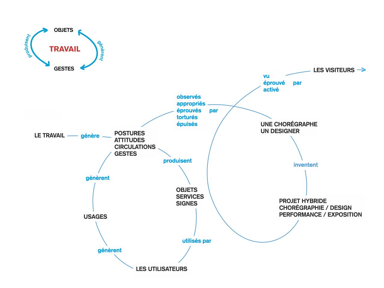 Autour, des objets qui génèrent des gestes qui produisent des objets ou des gestes qui produisent des objets qui génèrent des gestes.