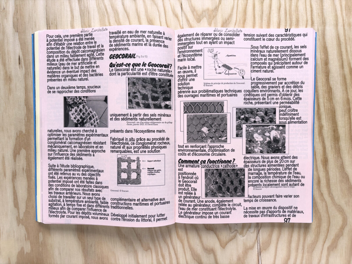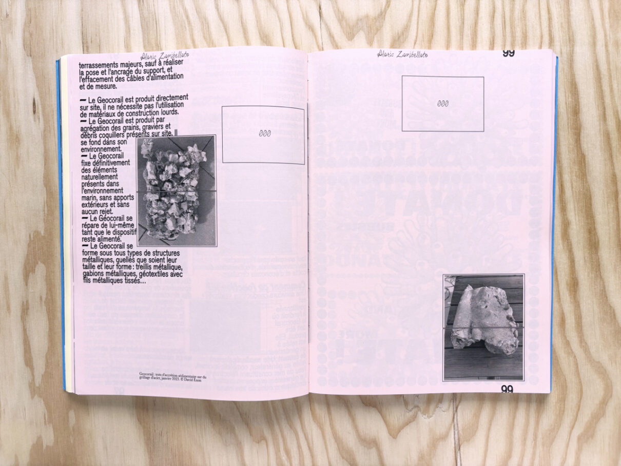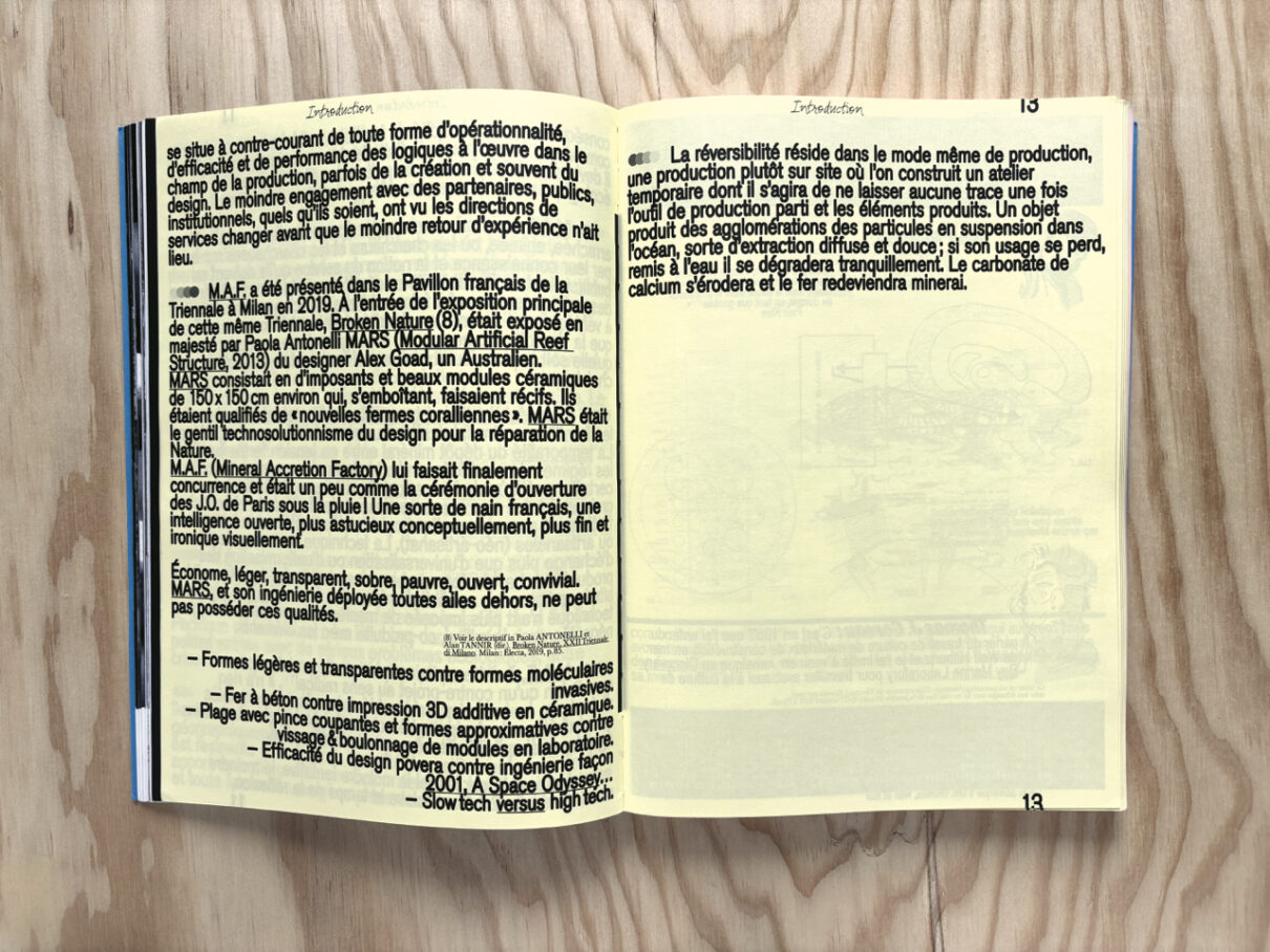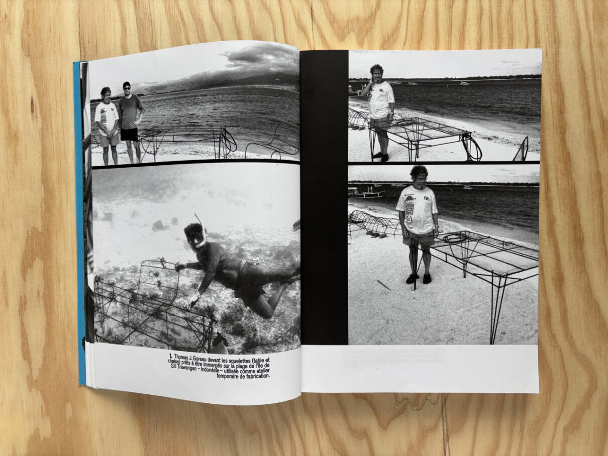 Low/Slow, Design et alterproduction situés presents the history of the Mineral Accretion Factory project—its evolution and the various branches it has developed (2011–2024). It traces the process used to design furniture and develop beaches and public spaces. It addresses the issues of coral restoration and coastal protection.