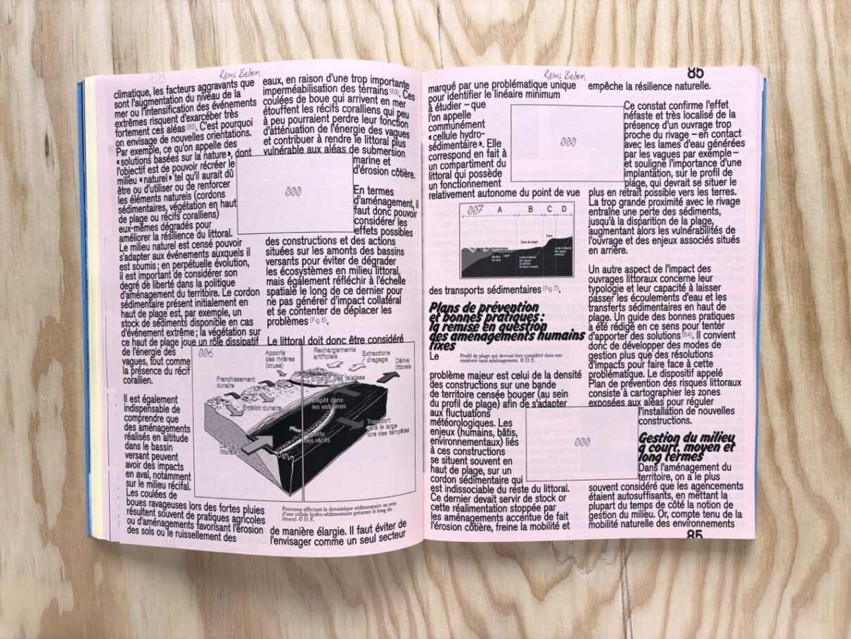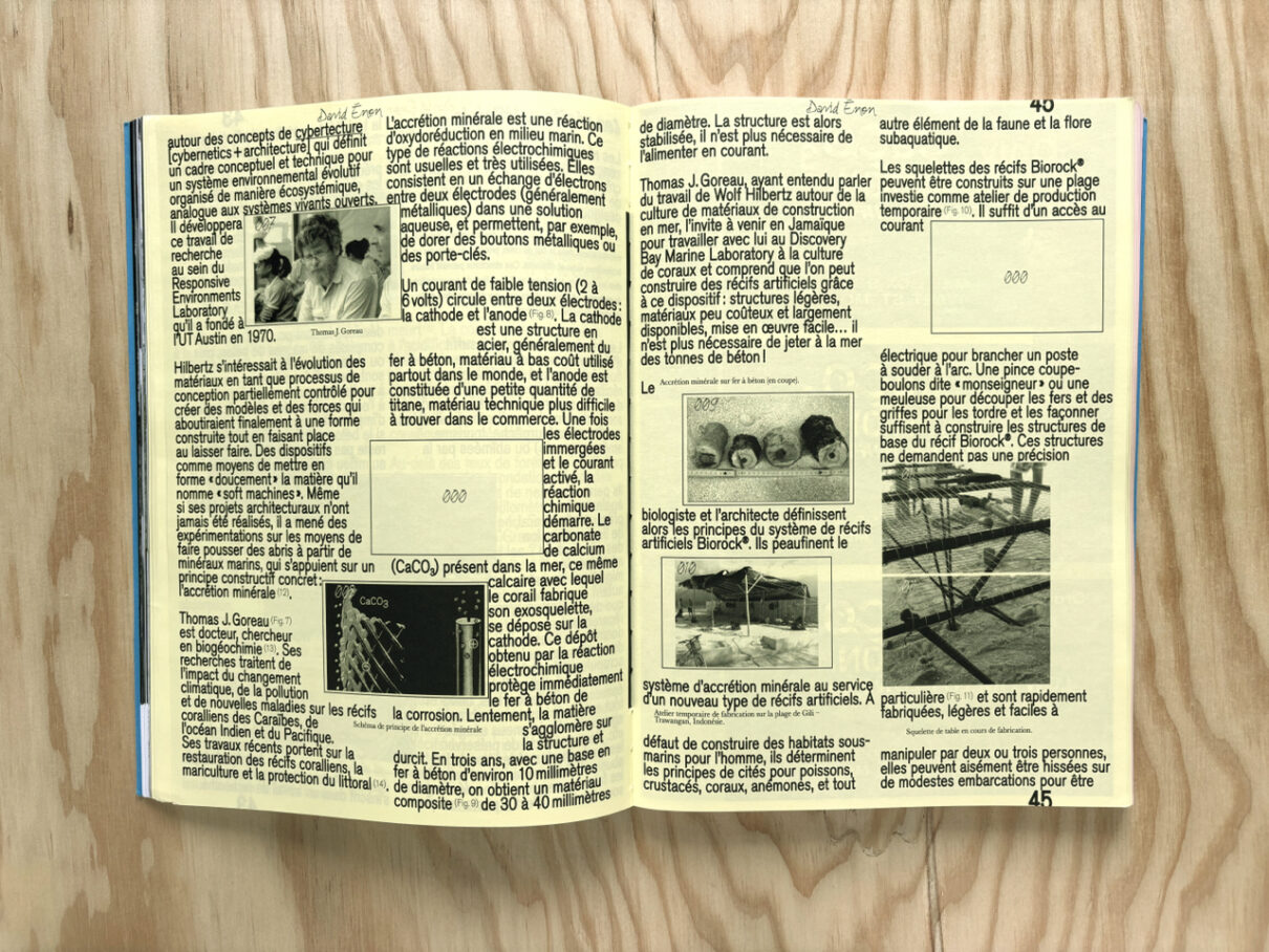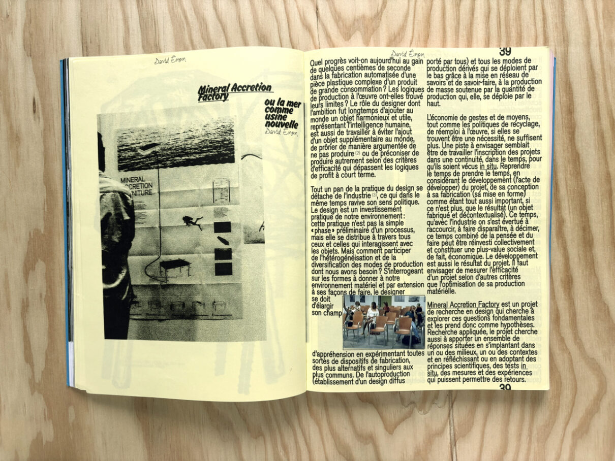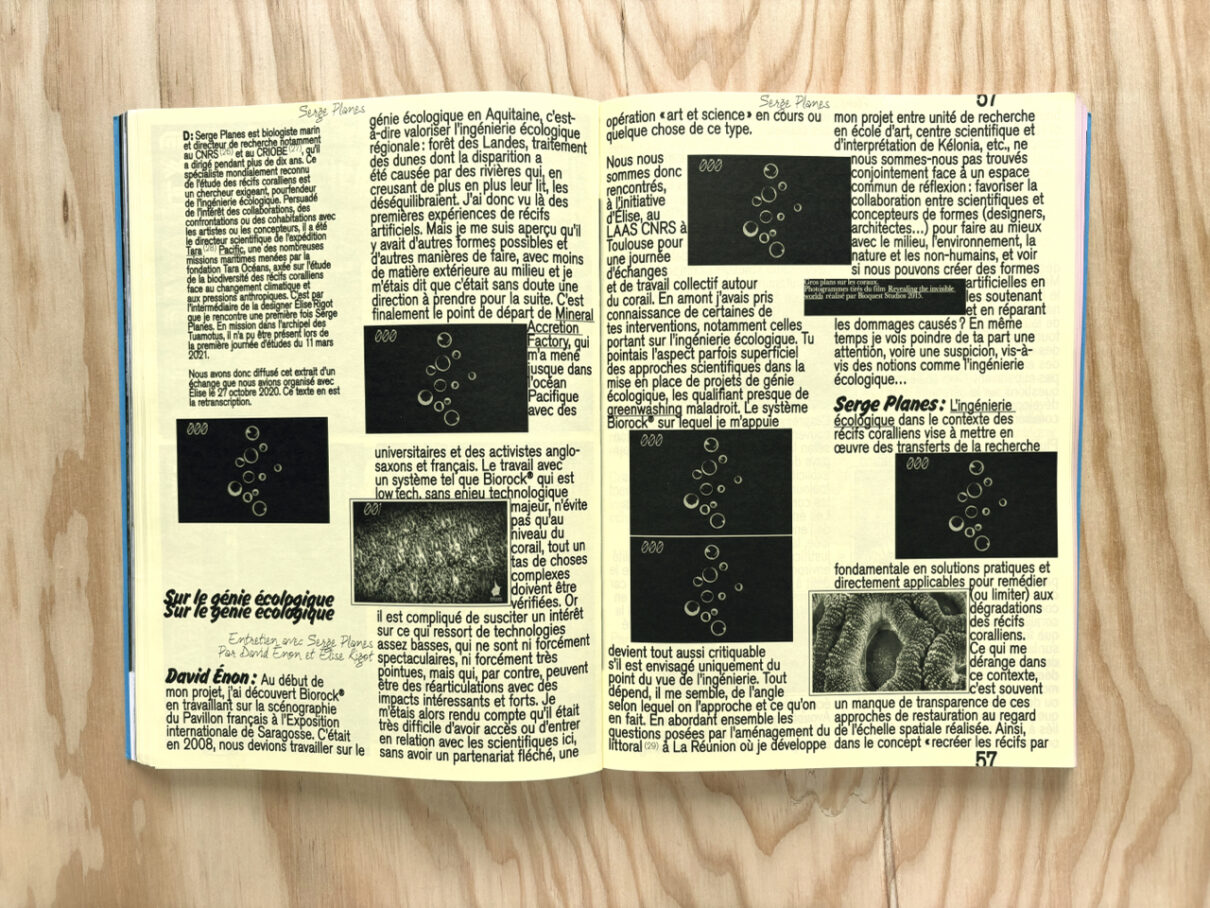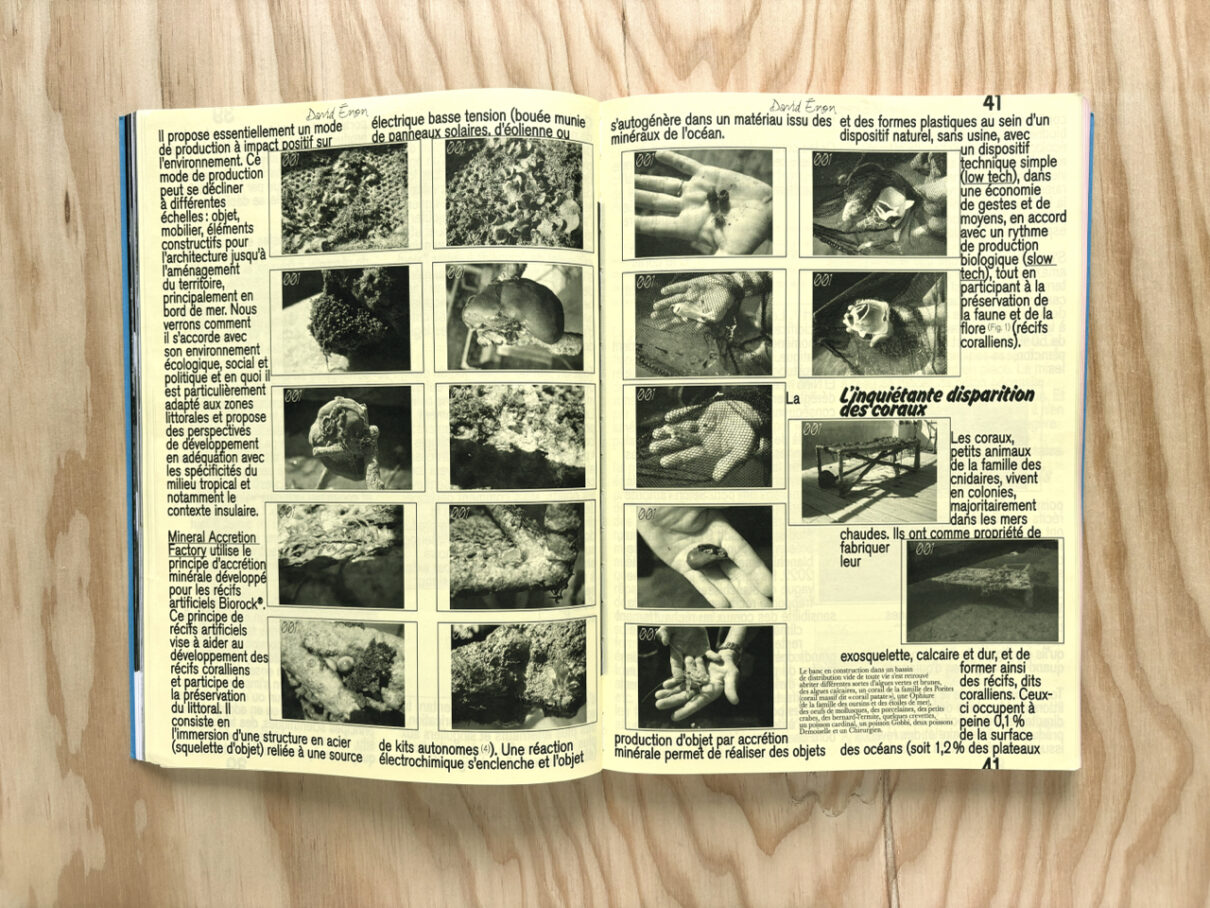 Low/Slow, Design et alterproduction situés presents the history of the Mineral Accretion Factory project—its evolution and the various branches it has developed (2011–2024). It traces the process used to design furniture and develop beaches and public spaces. It addresses the issues of coral restoration and coastal protection.
