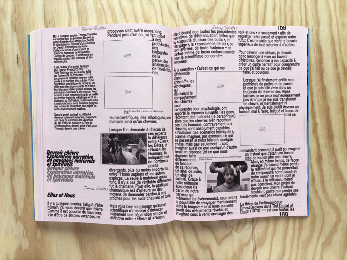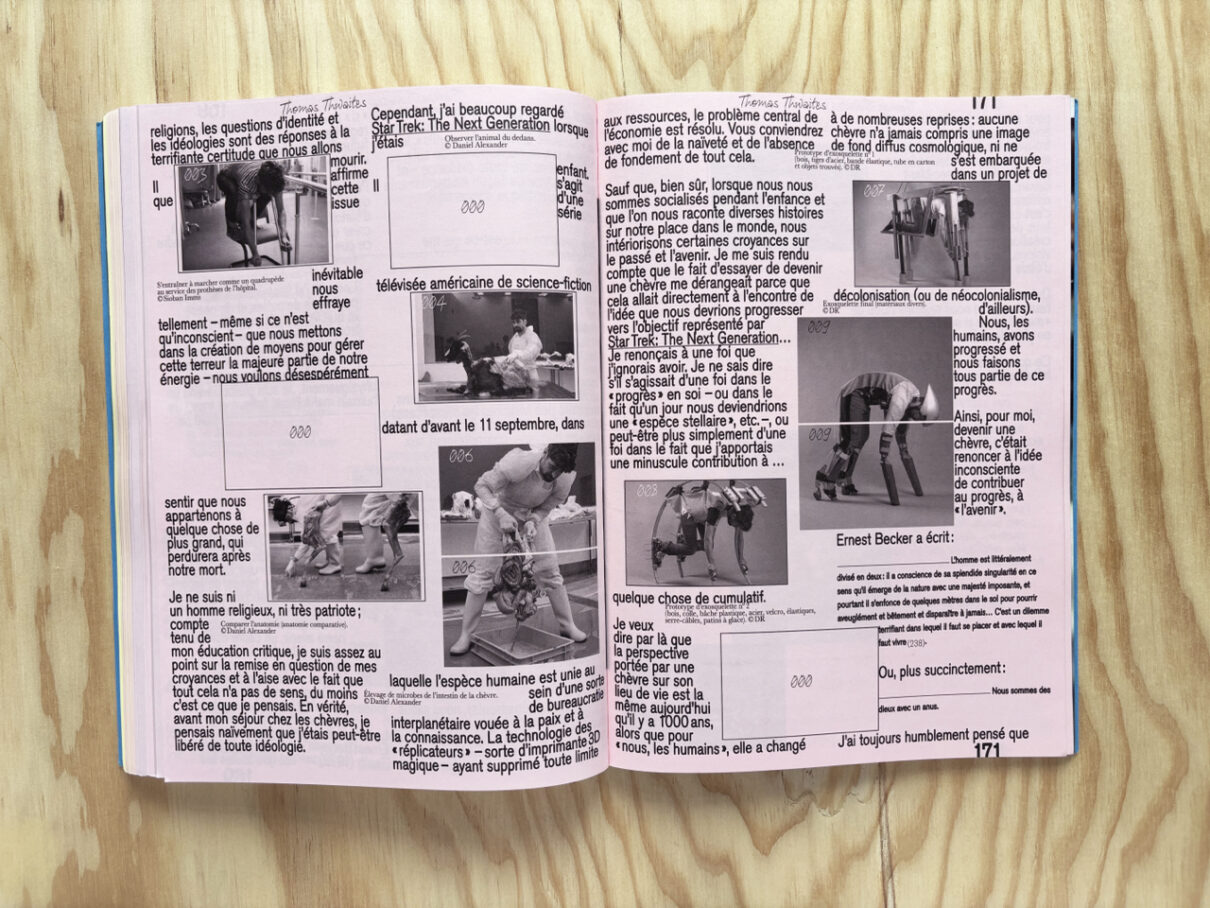 Thomas Thwaites. Designer et maitre de conférence (Central Saint Martins, Londres). Il s’intéresse aux impacts sociaux de la science et de la technologie. Il est l’auteur de The Toaster Project : Or a Heroic Attempt to Build a Simple Electric Appliance from Scratch (2011) et GoatMan, How I took a Holiday from Being Human (2016), publiés aux Princetown Architectural Press.