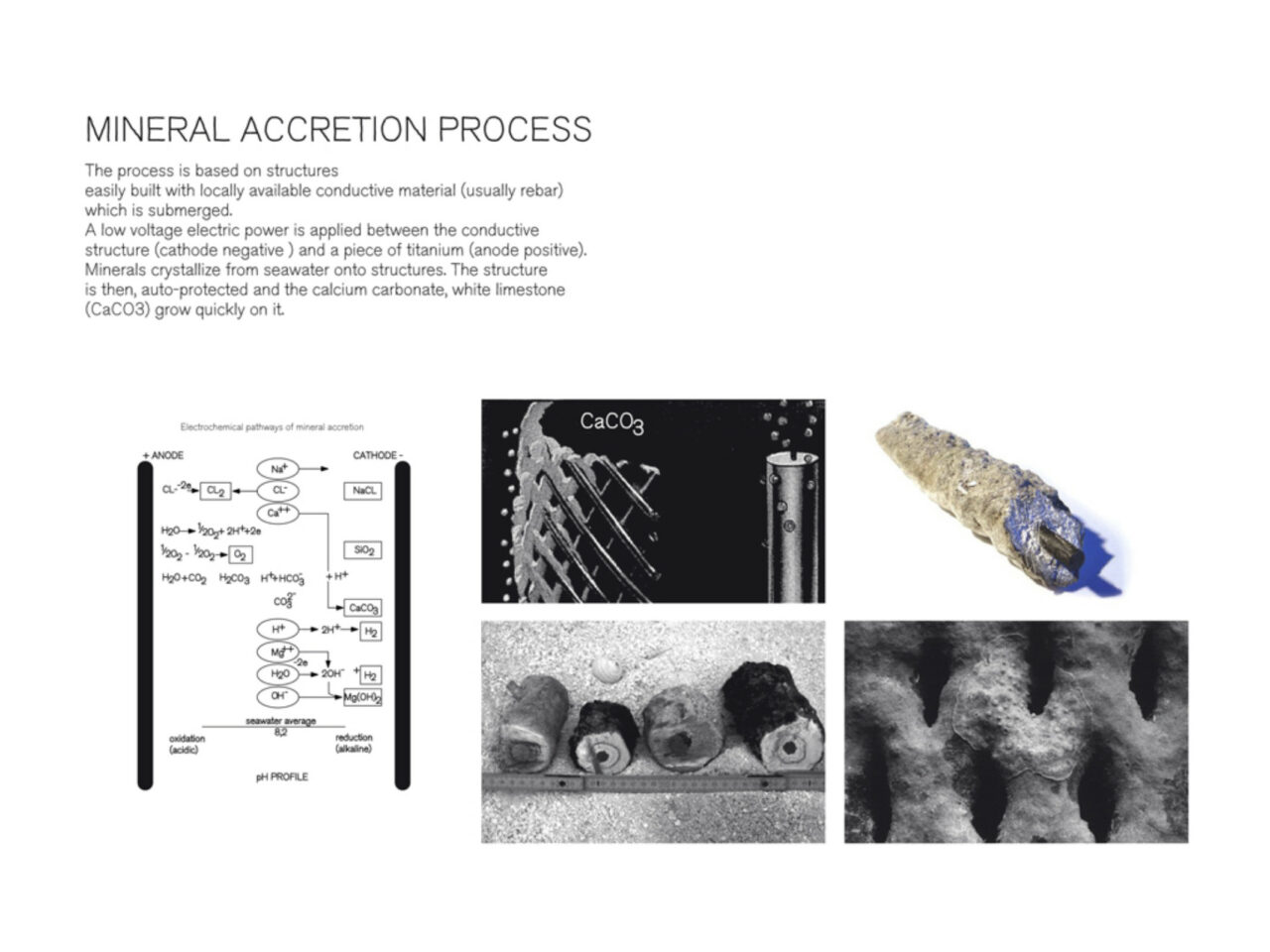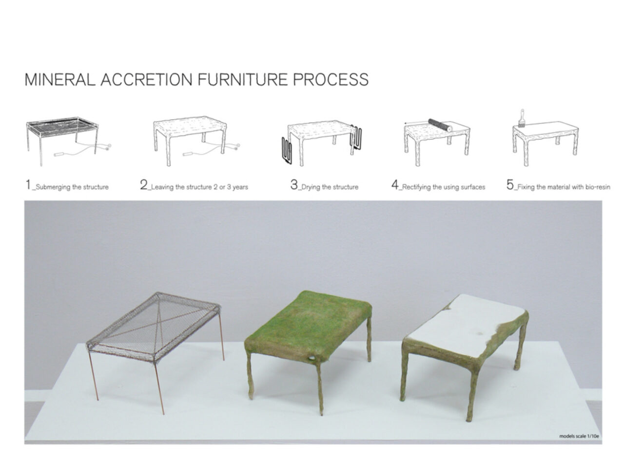 Mineral Accretion Furniture est un système de production de mobilier et d’objets qui utilise le procédé de production de récifs artificiels “Biorock” développé par l’architecte/biologiste Pr. Wolf Hilbertz et le Biologiste Pr. Thomas J. Goreau pour la restauration des récifs coralliens et des fonds marins en général (faune, flore).