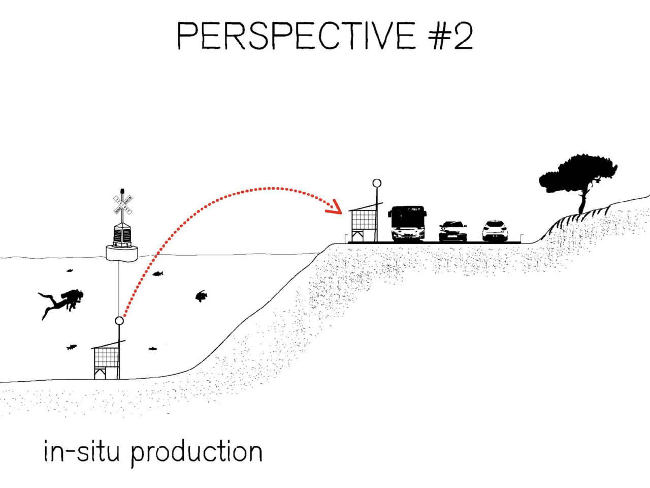 Mineral Accretion Furniture is a system for producing furniture and objects using the « Biorock » artificial reef process developed by architect/biologist Prof. Wolf Hilbertz and biologist Prof. Thomas J. Goreau for restoring coral reefs and the seabed in general (fauna, flora). M.A.F. involves immersing a steel structure (object skeleton) in the sea, connected to a low-voltage electrical source (solar panel / wind turbine). A redox reaction is triggered, the skeleton protects itself and the object is self-generating. The object’s main material is derived from ocean minerals from the ocean.