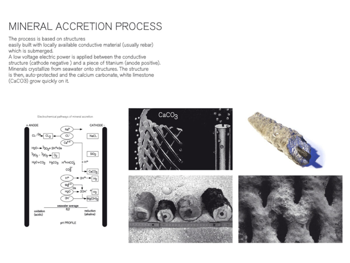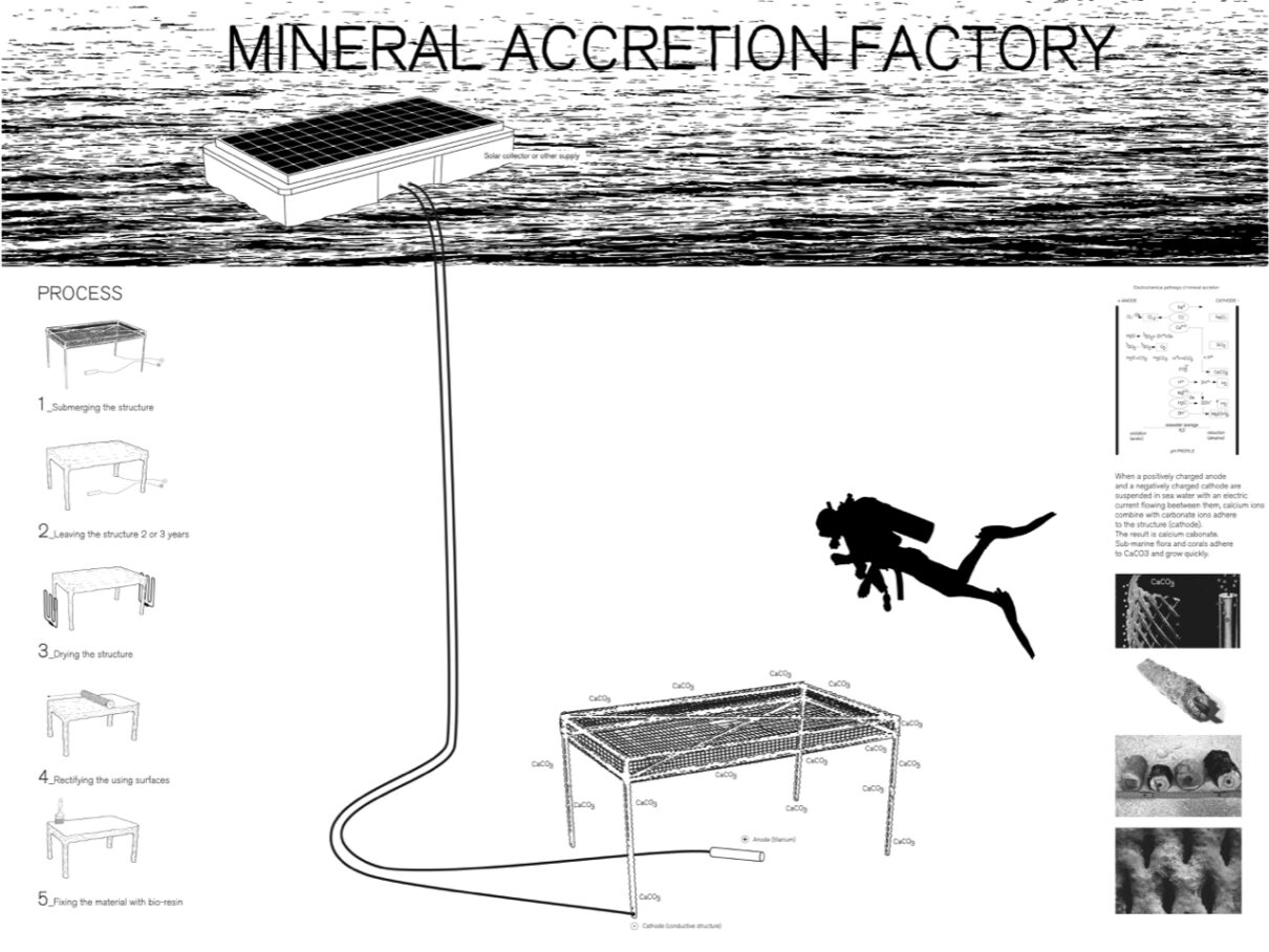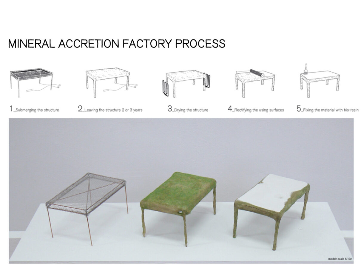 Mineral Accretion Factory est un système de production de mobilier et d’objets qui utilise le procédé de production de récifs artificiels “Biorock” développé par l’architecte/biologiste Pr. Wolf Hilbertz et le Biologiste Pr. Thomas J. Goreau pour la restauration des récifs coralliens et des fonds marins en général (faune, flore).
