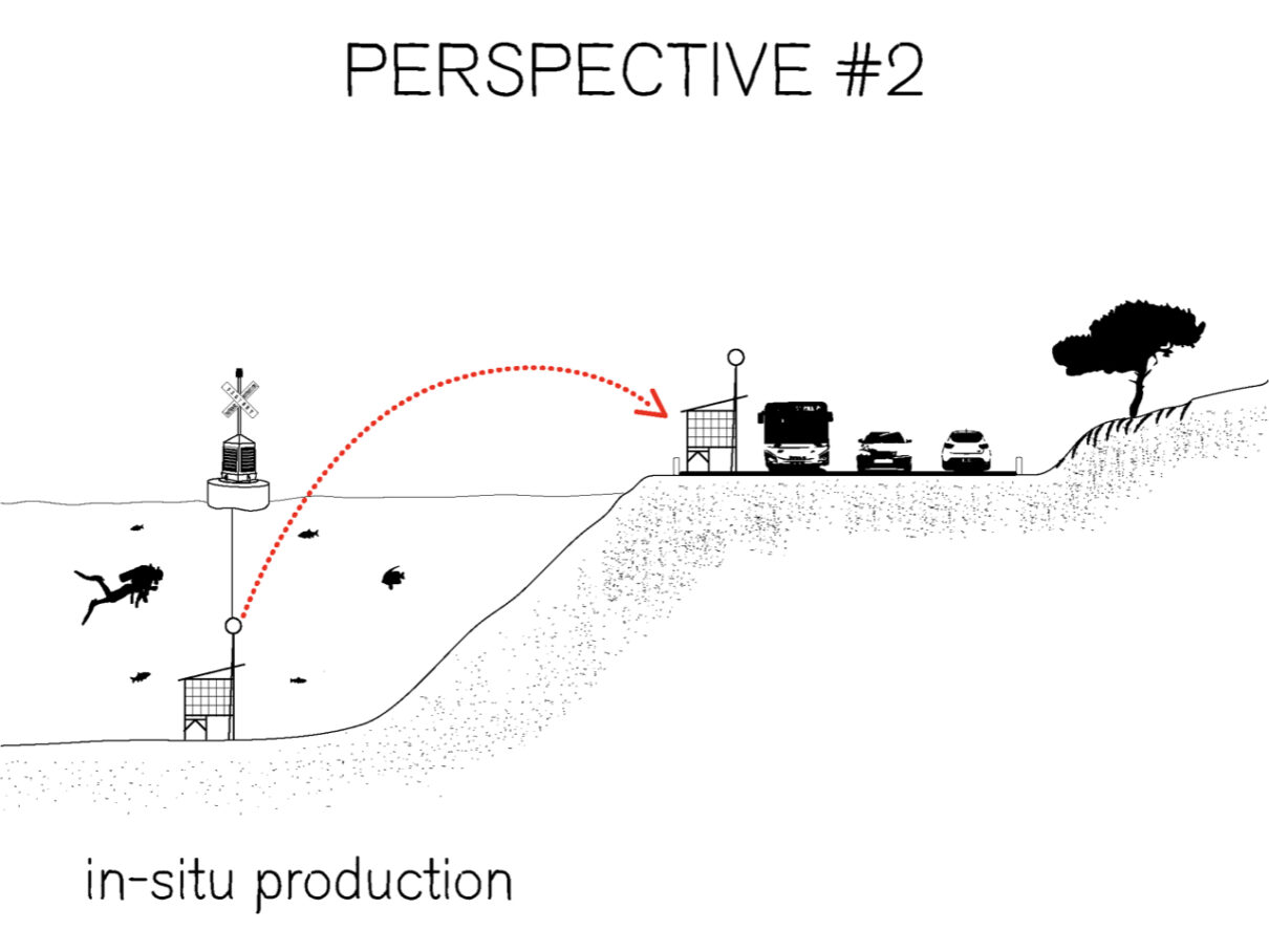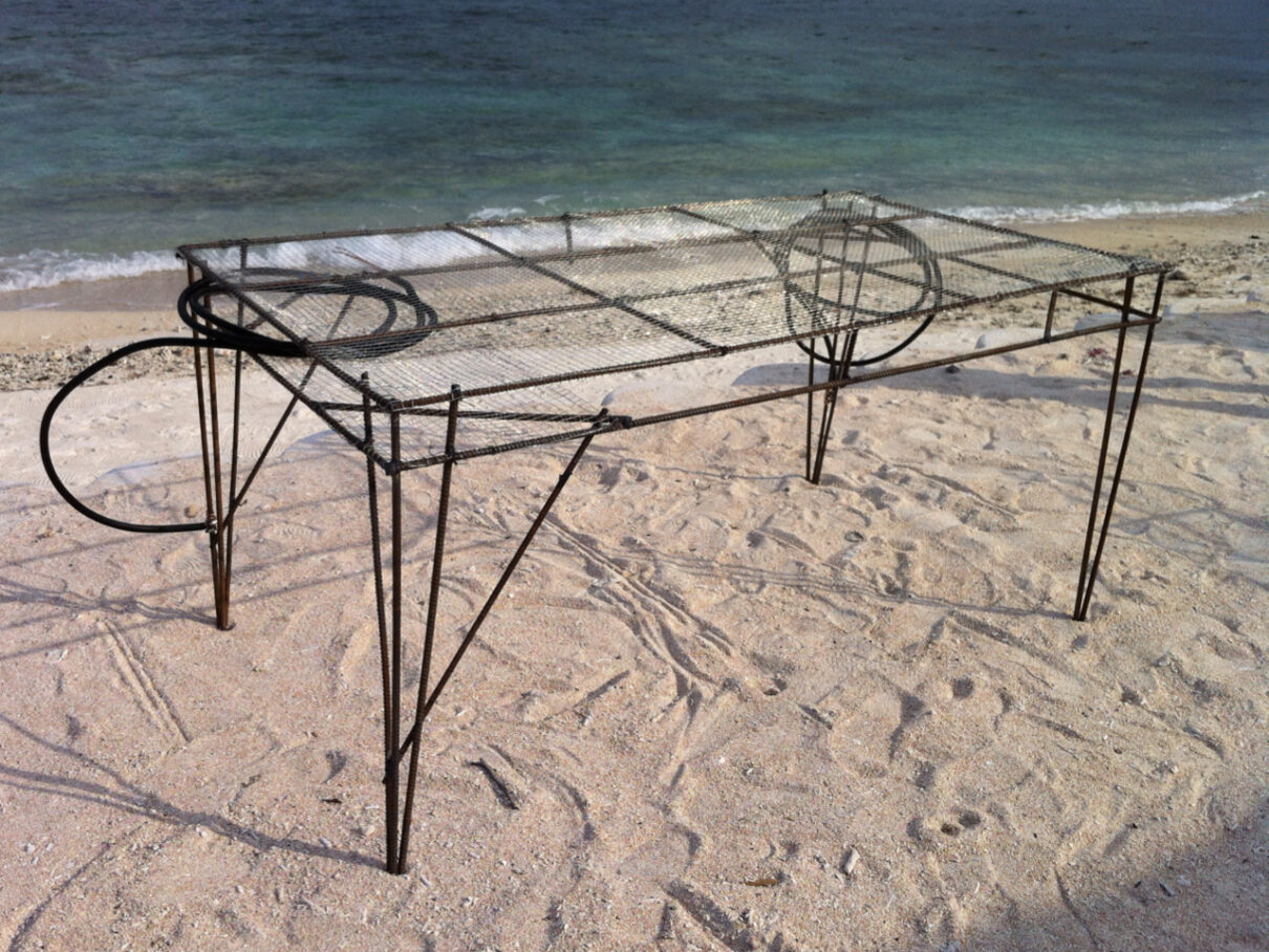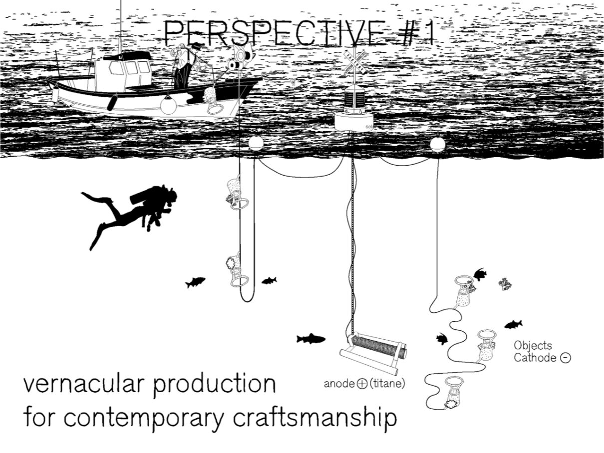 Mineral Accretion Factory is a system for producing furniture and objects using the « Biorock » artificial reef process developed by architect/biologist Prof. Wolf Hilbertz and biologist Prof. Thomas J. Goreau for restoring coral reefs and the seabed in general (fauna, flora). M.A.F. involves immersing a steel structure (object skeleton) in the sea, connected to a low-voltage electrical source (solar panel / wind turbine). A redox reaction is triggered, the skeleton protects itself and the object is self-generating. The object’s main material is derived from ocean minerals from the ocean.