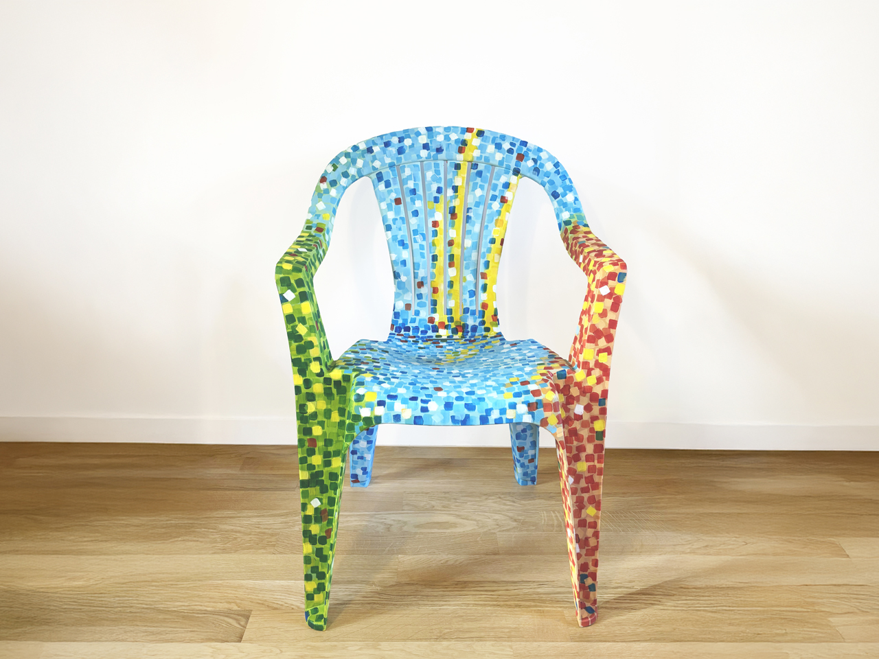 Peinture acrylique sur chaise monobloc plastique trouvée, 2025